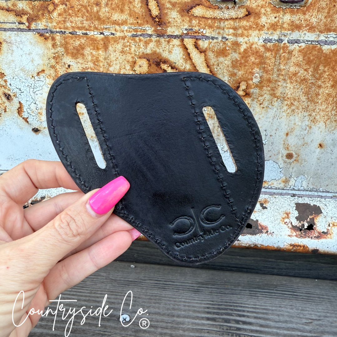 The Gambler Knife Sheath features a hand-painted and tooled leather front that adds personality to your gear. Its smooth leather back provides comfortable, durable support, making it the perfect companion for your cutting-edge adventures with a playful edge.
